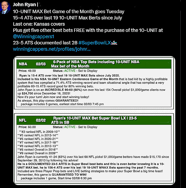 Imagine stumbling upon a legendary wizard in the world of sports betting—one whose spells of success have turned ordinary wagers into mountains of profits for over three decades. That's the electrifying thrill awaiting you with John Ryan, a master handicapper who's not just beaten the odds but rewritten the rulebook. With 30+ years dissecting pro sports and 42 years conquering financial markets like S&P 500 futures, commodities, FOREX, and Bitcoin, John is the ultimate alchemist, transforming data into gold.His accolades? Legendary. He snagged 2nd place in a global investor showdown by Investors Business Daily, catapulting him into Wall Street stardom. John's dominated dozens of contests, finishing 8th among 125 elite pros in 2024 for total profits—his 7th Top-10 in the last 10 years and 9th Top-25 in the past 20. Certified in Python, Azure, Power BI, and AI, he's engineered colossal sports databases brimming with unbeatable algorithms. Picture this: systems that haven't seen a losing season in over 10 years, and a select few that have crushed it for 30 straight without a single red mark!But here's the magic: John doesn't just hand you picks—he unveils the WHY. His in-depth research reports decode the science behind every edge, blending Wall Street savvy from his days as an institutional trader and Chief Currency Strategist. He actively trades futures, options, ETFs, and crypto (specializing in S&P 500, Crude Oil, SPY, and Bitcoin), sharing strategies on X. Discover the profound synergies: sports betting isn't gambling—it's disciplined investing, just like trading markets, and John's clients have reaped fortunes for decades.Dive into his picks pages for free samples and past premium wins that showcase his enlightening edge. At an unbeatable price, his all-access subscription at DubHub unlocks these money-making secrets, empowering you with knowledge, confidence, and fun. Don't miss out—subscribe now and watch your wins soar!Bet with your heads and never over it—may all the wins be yours.